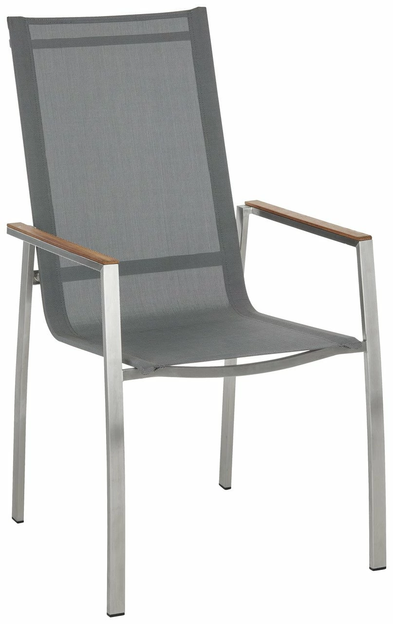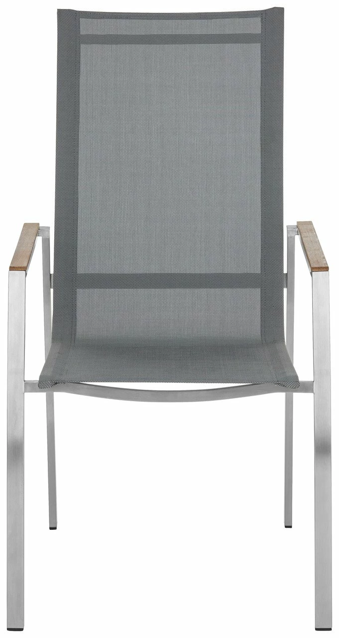 Der B/H/T ca. 56 x 103 x 65 cm große Sessel ist dank Edelstahlgestell, Textilbezug und einer Armlehne mit Holzverkleidung sehr pflegeleicht und trotzt auch widrigen Wetterbedingungen. Mit 5,5 kg ist er angenehm leicht zu handhaben. Belasten können Sie den Stuhl, der sich problemlos stapeln lässt, mit bis zu 120 kg. Entspannen Sie im Garten auf dem Amatio Gartensessel „CHUR“!