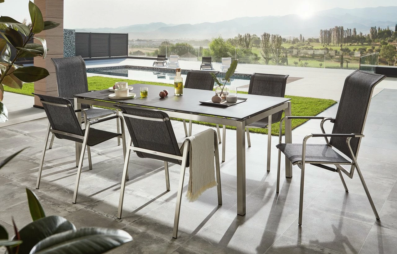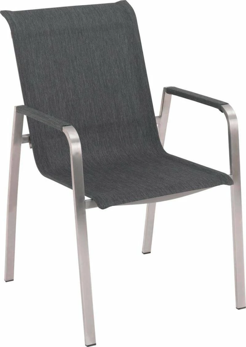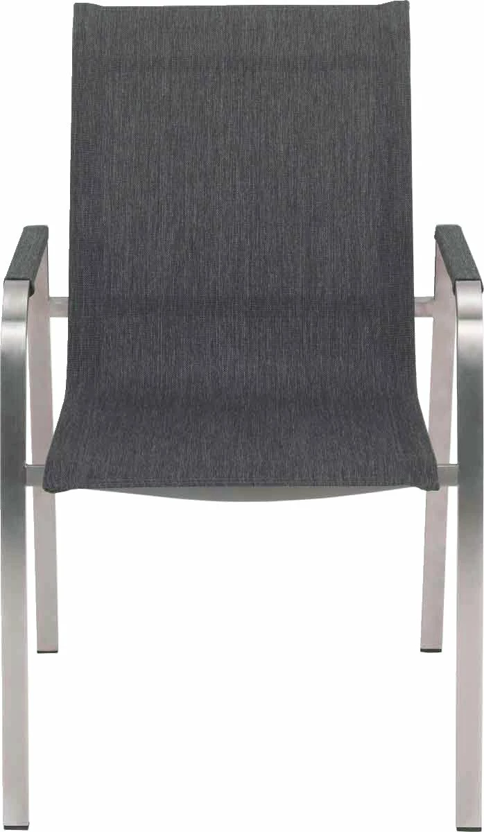 Das B/H/T ca. 56 x 91 x 65,50 cm große Sitzmöbel kann bis zu 120 kg belastet werden. Es verfügt über Stuhlbeine aus Edelstahl und einen Textilene-Bezug in Anthrazit, der nur nebelfeucht abgewischt werden sollte. Besorgen Sie sich den Stapelsessel „CAP BENAT“ von Amatio!