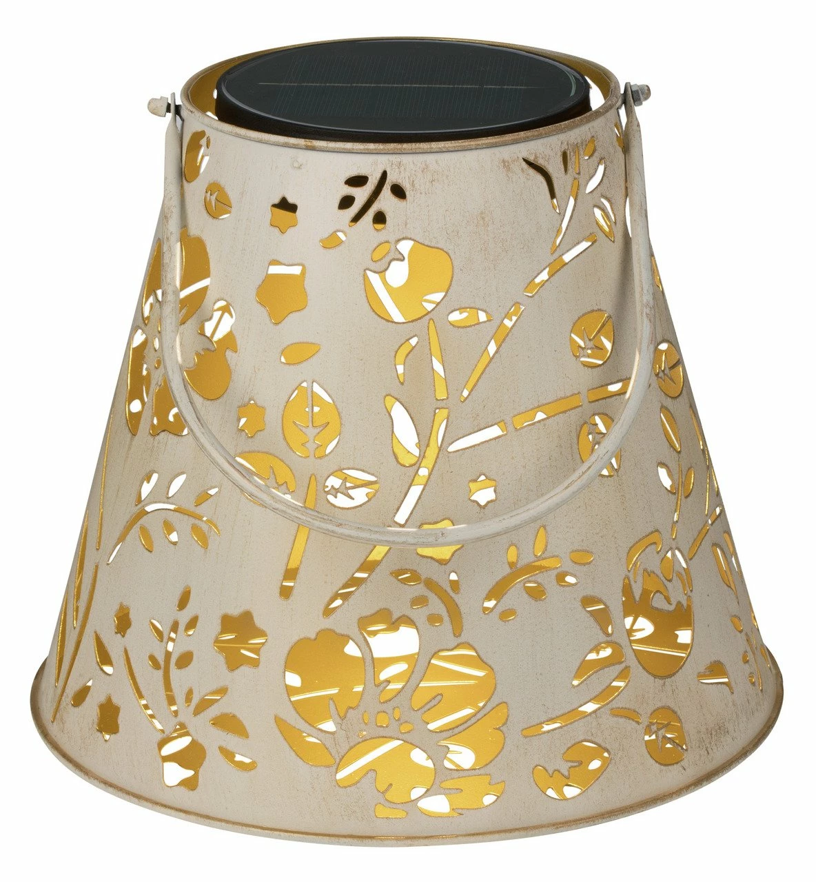 Ein ausgestanztes Blumendesign sorgt bei der LED-Solarleuchte „BERN“ für bezaubernde Lichtreflexe. Die graue Metall-Leuchte (D/H ca. 27 x 22,8 cm, 0,9 kg, inklusive Batterie) ergänzt jeden Gartentisch. Ihr integriertes solarbetriebenes LED-Leuchtmittel (Schutzklasse I) spendet warmweißes Licht (4.000 K, CRI: >80).