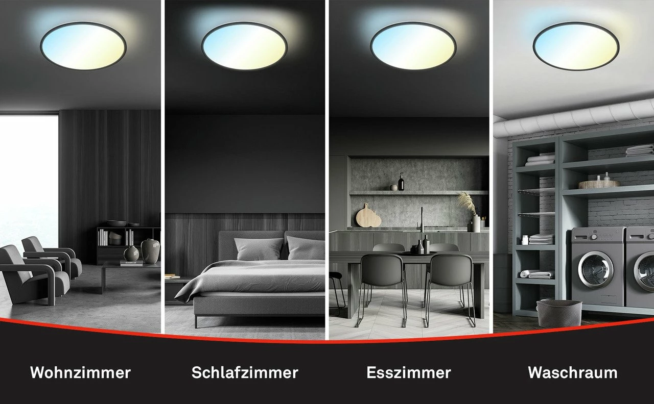 Die Briloner LED-Deckenleuchte „B-SMART“ bietet funktionales Lichtdesign, das für bessere Laune sorgt. Dank des extrem flach gehaltenen schwarzen Aufsatzrahmens (D/H ca. 42 x 2,5 cm, Gewicht 1,19 kg, Deckenmontage) mit mattweißer Kunststoffblende lässt sich die hochwertige Ausführung in jeden gewünschten Wohnbereich integrieren. Für stimmungsvolle Raumatmosphäre sorgen der Backlight-Effekt sowie der Farbwechsler (2.700-6.500 K). Seine fest verbaute dimmbare 22-W-LED-Platine (durchschnittliche Lebensdauer 20.000 Stunden, IP20, 230 V) erhellt mit 3.000 lm jede Zimmergröße. Dank Fernbedienung (Wifi/Bluetooth) mit Memory-, Timer- und Nachtmodus ist die Leuchte bequem steuerbar. Nehmen Sie die Briloner LED-Deckenleuchte „B-SMART“!