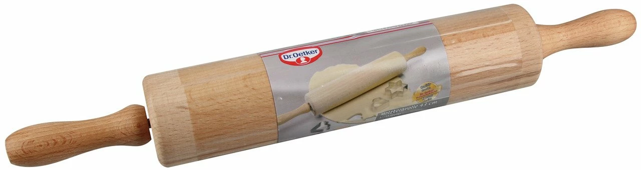 Ein unverzichtbares Küchenzubehör ist der Dr. Oetker Teigroller. Das braune, klassisch geformte Holzmodell misst D/T ca. 6 x 44 cm und liegt besonders gut in der Hand. Mit ihm rollen Sie Hefeteig, Mürbeteig oder Blätterteig im Handumdrehen gleichmäßig aus.