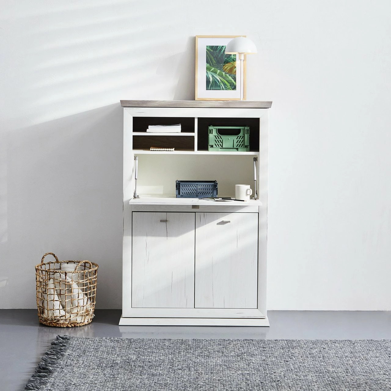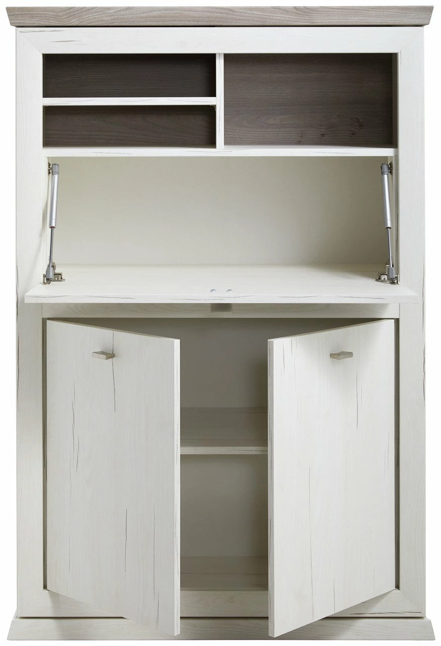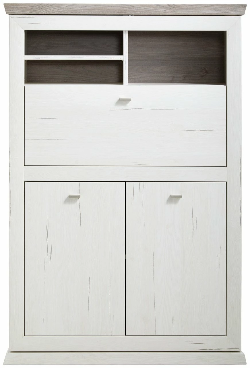 Der Hom´in Sekretär „CAMRON“ mit geschlossenem Sockelunterbau bewahrt das ordentliche Erscheinungsbild im nordisch inspirierten Wohnbereich. Sein an traditionelle Cottagemöbel angelehntes Design zeigt ein weißes Pine-Aurelio-Dekor, welches von der grauen| Deckplatte sowie nickelfarbenen Metallgriffe stilsicher ergänzt wird.