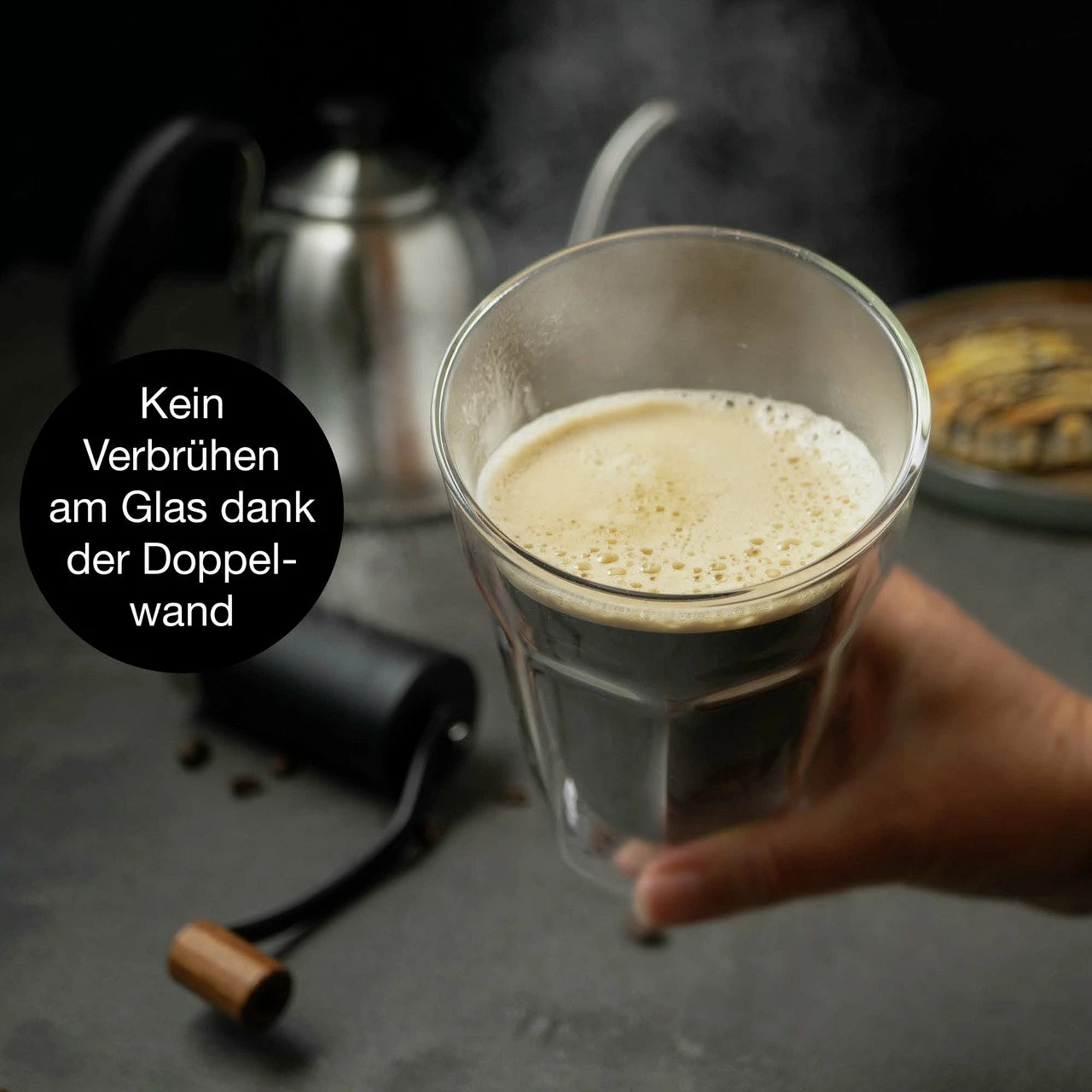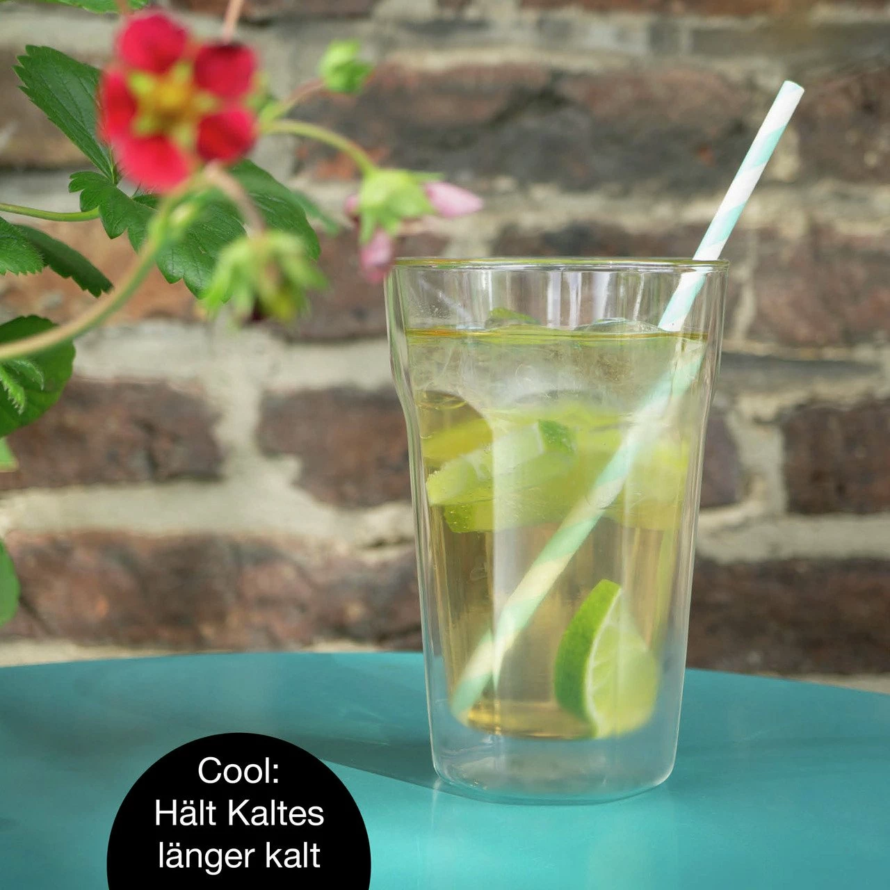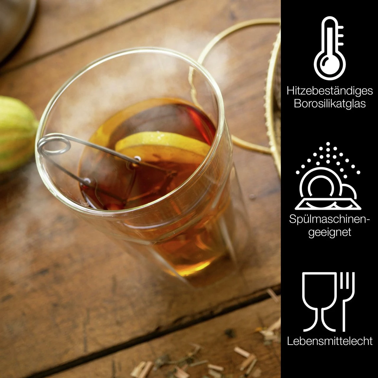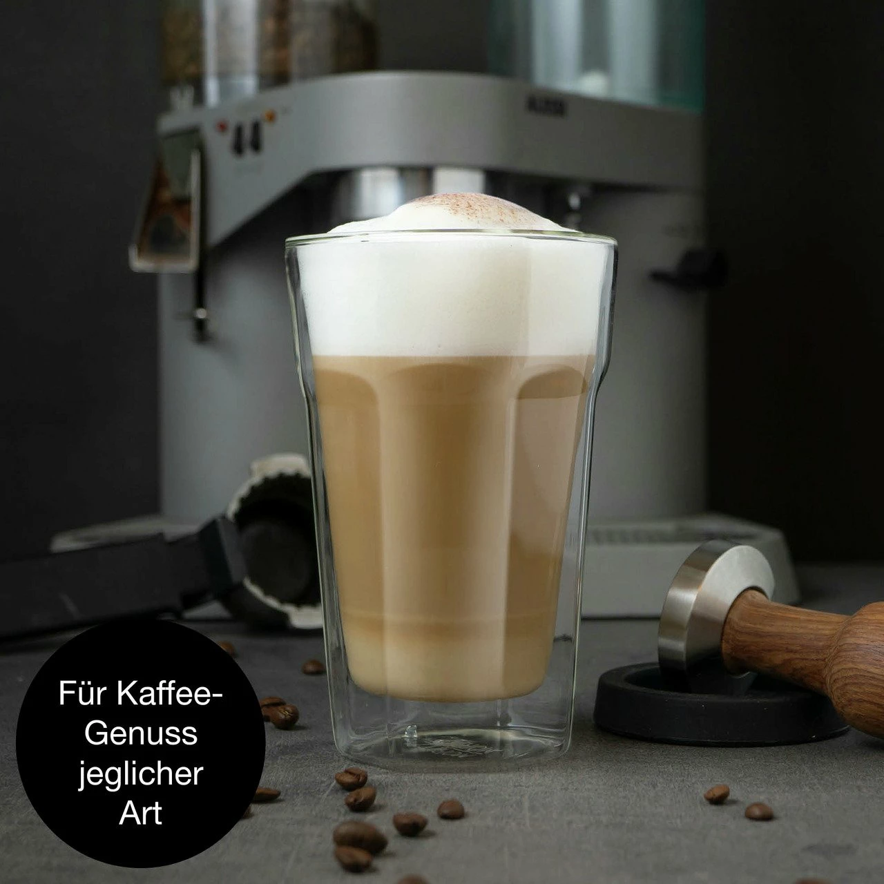 Die doppelwandigen Moritz & Moritz Latte Macchiato Thermo-Gläser 4-tlg. nehmen Heiß- und Kaltgetränke auf. Sie bestehen aus kratzfestem Borosilikat-Klarglas (Handarbeit). Im spülmaschinengeeigneten Set (L/B/H ca. 22 x 22 x 17 cm, 0,56 kg, 0,48 l) sind vier Gläser (jedes ein Unikat).