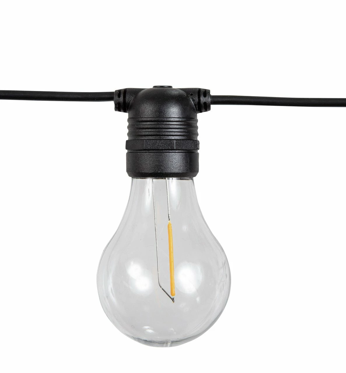 Die New Garden Lichterkette „ALLEGRA“ kann im Haus, aber auch im Gartenbereich ihren Einsatzort finden. Bestückt mit zehn klassisch geformten LED-Glühbirnen (à 2 W, fest verbaut, Energieeffizienzklasse A+, Lebensdauer 20.000 Stunden, IP44) am schwarzen Kunststoffkabel fügt sich die Lichterkette zu jedem Wohn- und Gartenambiente. Mit ihrem Gesamtmaß von B/H/T ca. 6 x 11,5 x 800 cm kann die hochwertige Lichterkette (0,67 kg) den Terrassenbereich, Balkon oder das Himmelbett ausleuchten. Dabei wird eine warmweiße Farbtemperatur (2.700 K) bei angenehmen 35 lm (mit Abdeckung) erzielt. Nehmen Sie die New Garden Lichterkette „ALLEGRA“!