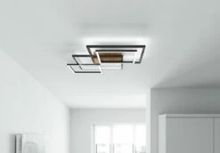 Lassen Sie sich von dieser formschönen LED-Deckenlampe begeistern. Über eine Fernbedienung ist die Deckenlampe benutzerfreundlich zu bedienen. Sie kann für eine individuelle Regulierung der Helligkeit nach Ihren Wünschen gedimmt werden. Die Deckenlampe liefert eine gemütliche tageslichtweisse Lichtfarbe. Sie hat ein Breitenmass von 50 Zentimetern, misst in der Gesamthöhe 8 Zentimeter und weist eine Länge von 50 Zentimetern auf. Kunststoff wurde bei dieser Deckenlampe verarbeitet. Die schwarze Deckenleuchte sorgt nicht nur für ein schönes Lichtspiel, sondern erfüllt auch einen dekorativen Zweck.