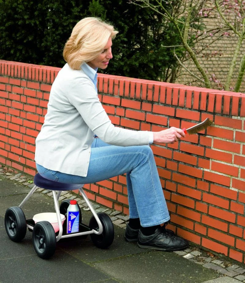 Gartenarbeit kann anstrengend sein – vor allem, wenn man in gebückter Haltung arbeiten muss. Mit dem Rollsitz Secura von wenko holen Sie sich Bequemlichkeit und Komfort in den Garten. Der rollbare Gartensitz mit einem Gestell aus silberfarbenem Metall zeigt sich zugleich leicht und stabil.