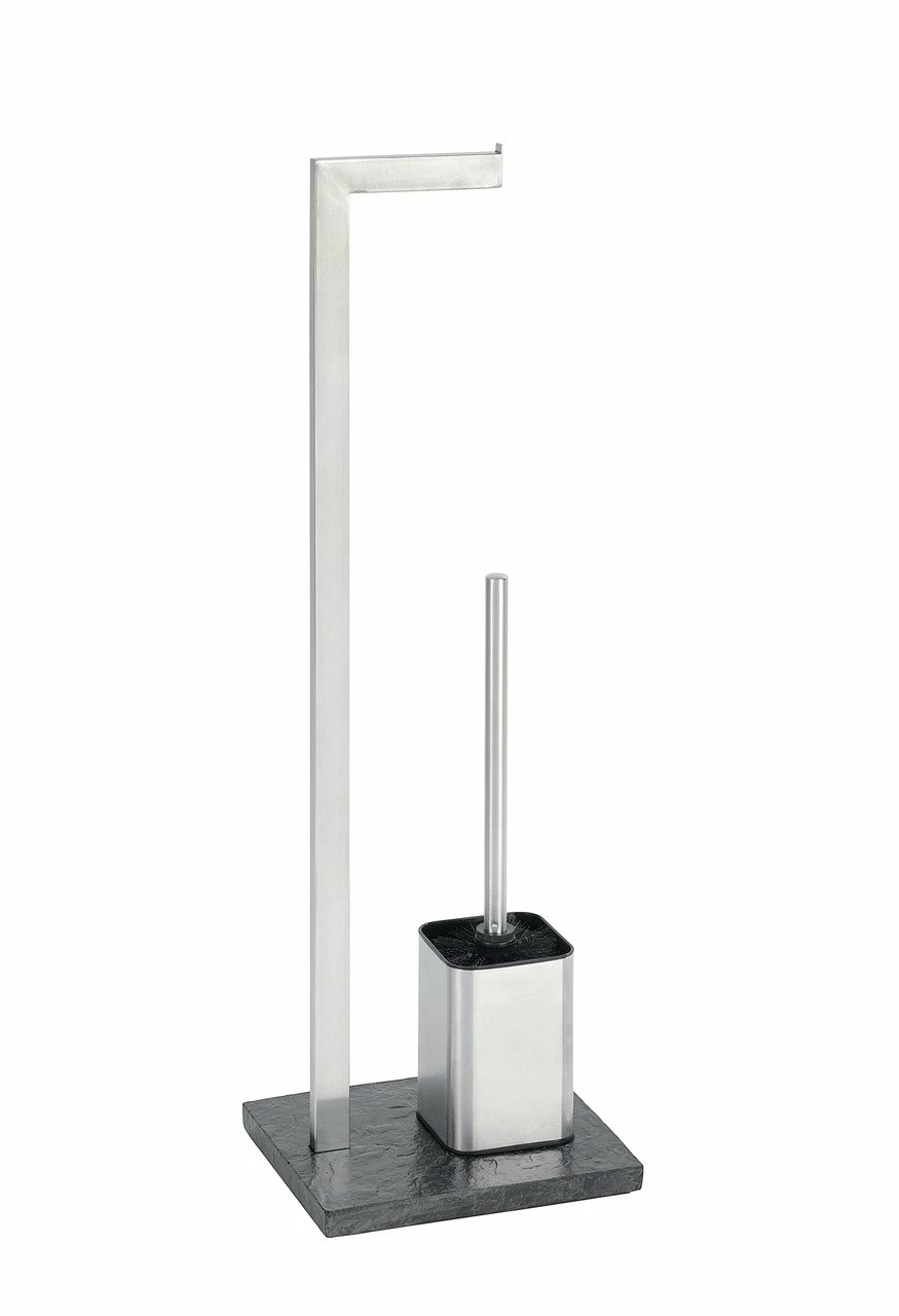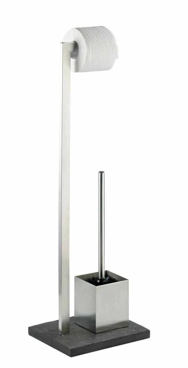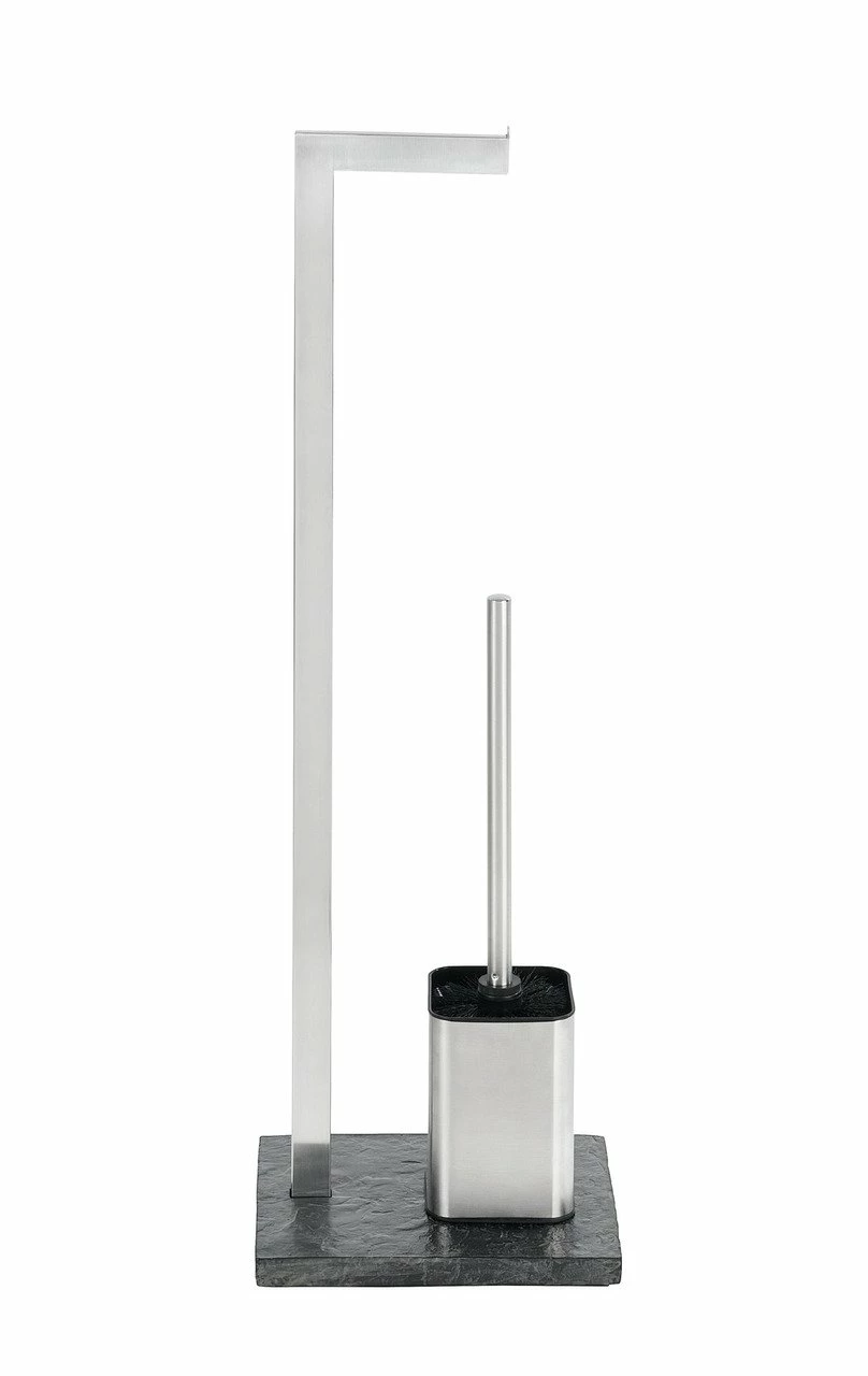 Mit der Stand WC-Garnitur „Slate Rock“ von Wenko haben Sie alles parat. Durch die standfeste Polyresin-Fußplatte zum eleganten Edelstahl-Design bleibt sie an ihrem Platz. Mit einer Größe von L/B/H ca. 19,5 x 23 x 73,5 cm ist die WC-Garnitur mit Toilettenpapierhalter eine ideale Ergänzung im Badezimmer oder in einem Gäste-WC. Besonders praktisch und hygienisch ist der auswechselbare WC-Bürstenkopf. Die Garnitur funktioniert alleine oder in Kombination mit den anderen Bad-Accessoires der Qualitätsmarke. Greifen Sie zu bei der Stand WC-Garnitur „Slate Rock“ von Wenko!