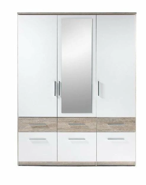 Der Z2 Drehtürenschrank 3-türig „BOX“ bietet einen klug eingeteilten Stauraum. Optisch präsentiert er sich mit Korpus und Schubladenfronten in Eiche sägerau/sonoma und weißer Front mit Spiegel.