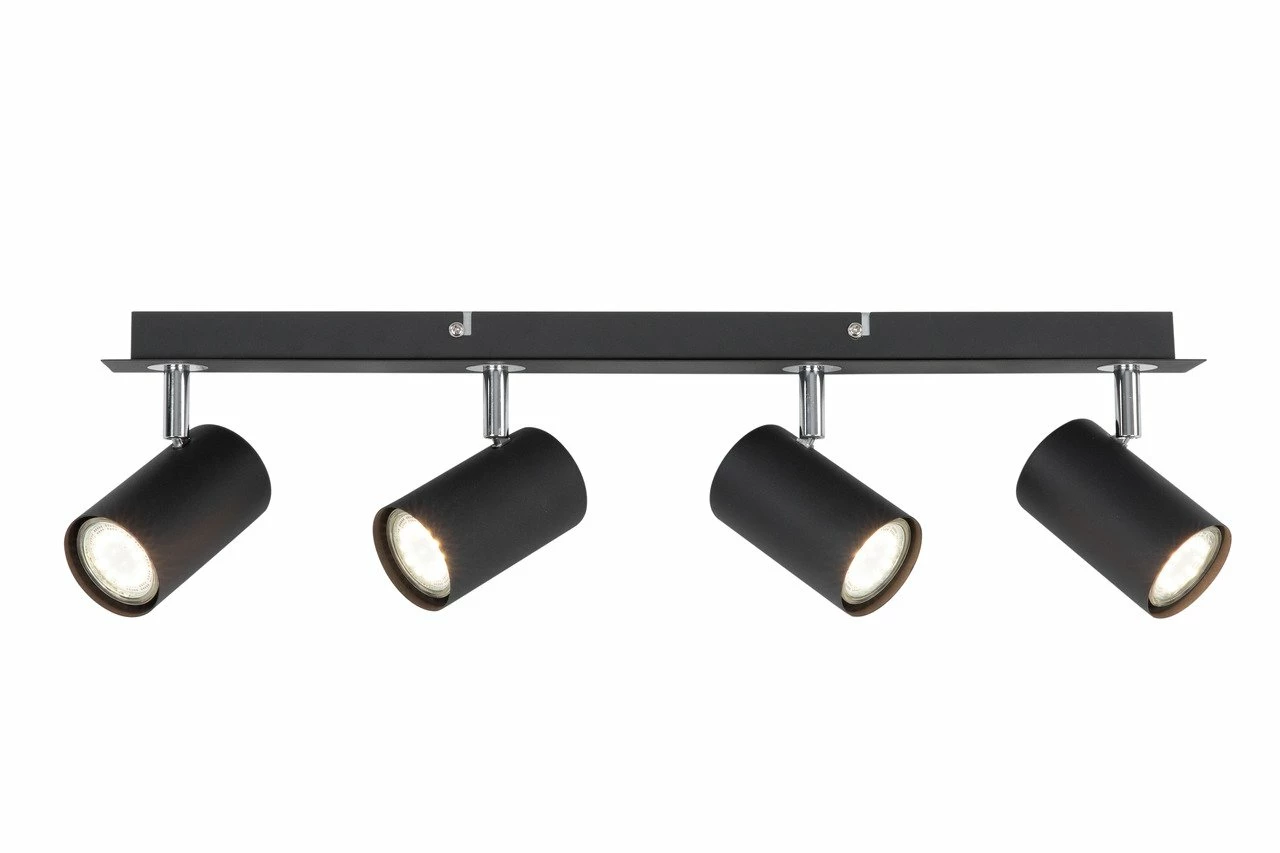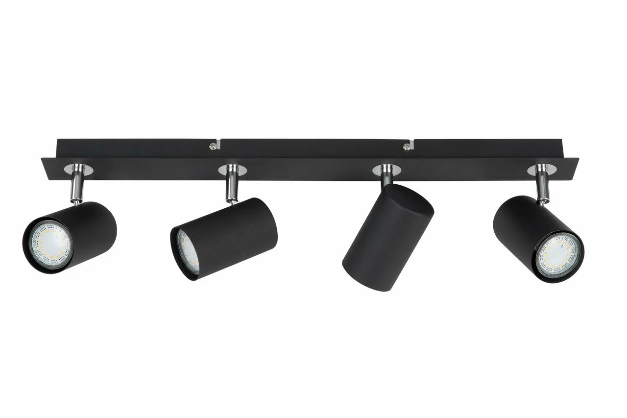Vier individuell ausrichtbare Strahler sorgen bei der Deckenleuchte für punktgenaue Ausleuchtung verschiedener Raumbereiche Ihres Zuhauses. Das Modell aus schwarzem Metall zeigt eine moderne und geradlinige Formsprache, die sowohl Einrichtungen mit Chrom und Glas abrundet als auch interessante Kontraste zu klassischen Stilen bietet. Hervorragend harmoniert sie mit Industriedesign. Sie bringen die L/B/H ca. 55 x 7,5 x 12 cm große Leuchte mit dem Gewicht von 2 kg mühelos an Ihrer Zimmerdecke an. In die vier GU10-Fassungen kommen Leuchtmittel mit jeweils 35 W, die angenehmes Licht spenden. Besorgen Sie sich die zeitlos-moderne Deckenleuchte!