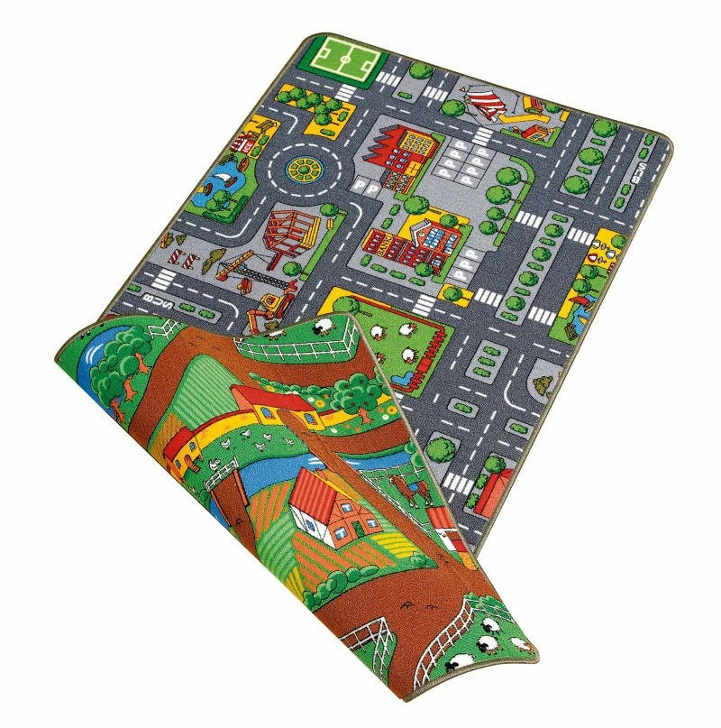 Auf dem Teppich DUO PLAY wird Ihr Kind eine schöne Zeit verbringen. Mit zwei verschiedenen Motiven, die einmal die Stadt und einmal das Land widerspiegeln, bietet er doppelten Spielspaß.
